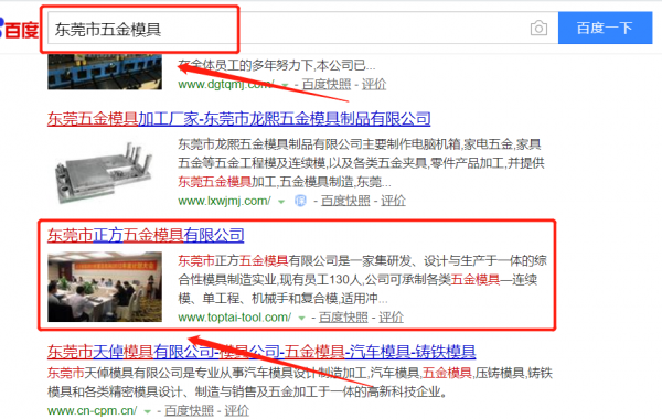 我們公司與東莞市正方五金模具有限公司合作中,對這個公司所經營的五金模具這個行業提供了百度快照排名,與該公司的合作,更多的客戶讓我們公司為其提供百度快照排名,通過每一次合作,我們公司不斷完善自己,同時希望合作伙伴在經營的路上越來越好。