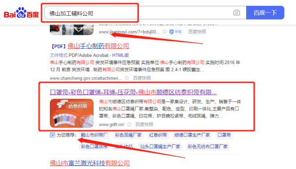 佛山市順德區紡*織帶有限公司百度排名快上詞效果展示