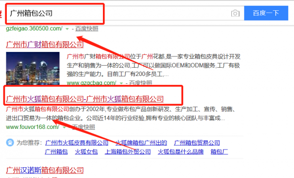 廣州市火狐箱包有限公司選用我司企業箱包的網站優化產品,其SEO關鍵詞有箱包。搶占百度、360搜索、搜狗等搜索引擎首頁自然排名(PC端 + 手機端),高客流量導入,SEO推廣效果更突出。廣州市火狐箱包有限公司成立于2003年,是經廣州市市場監督管理局審核的有資質的公司,其統一社會信用代碼:914401017459795408。公司地址:廣東省廣州市白云區三元里街解放北路1339號圣嘉皮具商貿中心二層2A378鋪(自主申報)。