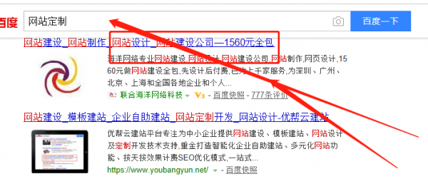 海洋網絡在百度網站定制關鍵詞中排位第一