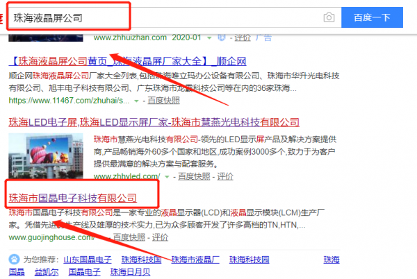 珠海市國晶電子科技有限公司選用我司企業液晶屏的網站優化產品,其SEO關鍵詞有液晶屏。通過對搜索引擎目標關鍵詞優化,使目標網站的相關信息顯示在百度首頁,為企業挖掘更多的潛在客戶的同時帶來海量的商機。珠海市國晶電子科技有限公司成立于2012年,是經珠海市市場監督管理局審核的有資質的公司,其統一社會信用代碼:91440400598911983B。公司地址:廣東省珠海市南屏科技工業園屏西七路5號廠房三樓3之4。