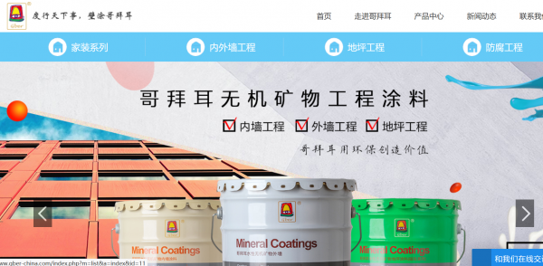 哥 拜耳涂料股份有限公司是一家集科研、生產、銷售與技術服務為一體的綜合型高科技企業,是中國早期生產無機涂料的企業。并且擁有自主研發團隊,參與制定行業標 準,無論生產規模還是市場占有都居全國前列。其主要產品有:哥拜耳水性內、外墻無機涂料、哥拜耳水性地坪無機涂料及配套的無機底漆、無機光油、哥拜耳防銹無 機涂料系列等天然、綠色、環保產品。Gber paint Co., Ltd is a comprehensive high-tech enterprise integrating scientific research, production and construction. It is the first company in China to produce inorganic coatings. The main products are: Ge Bayer waterborne, inorganic coating for outdoor and supporting, outer wall dedicated silicon fiber anti cracking putty, brother Bayer water floor of the inorganic coatings and auxiliary primer and inorganic, inorganic light oil, brother Bayer Jiezhuang inorganic coating series natural, green, environmental protection products.公司在全國各地設有代理機構,產品已廣泛用于工業與民用建筑、公共建筑與市政設施、舊建筑改造、以及家具行業等。由于該產品不含有害物質、超強耐候、防 火阻燃、耐水浸、不褪色、不長霉、抗酸堿、天然環保等特點,深受廣大用戶歡迎。公司秉承以人為本的宗旨,將不斷的追求卓越創新,靠質量和服務贏得客戶,靠 客戶信賴贏得發展,為社會創造一個綠色環保的世界。