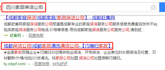 我們公司與成都巧媳婦家政服務有限公司合作中,對這個公司所經營的家政保潔這個行業提供了百度快照排名,與改公司的合作,更多的客戶讓我們公司為其提供百度快照排名,通過每一次合作,我們公司不斷完善自己,同時希望合作伙伴在經營的路上越來越好。