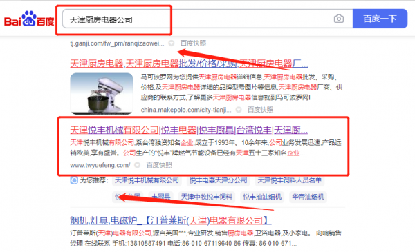我們公司與天津悅*機械有限公司合作中,對這個公司所經營的廚房電器這個行業提供了快速排名,與該公司的合作,更多的客戶讓我們公司為其提供SEO推廣,通過每一次合作,我們公司不斷完善自己,同時希望合作伙伴在經營的路上越來越好。