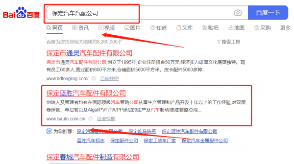 保定藍*汽車配件有限公司選用我司企業汽車汽配的網站優化產品,其SEO關鍵詞有汽車汽配。各搜索引擎網絡營銷推廣,一站式策劃、建站、推廣等整合服務,快速提升曝光率、轉化率、成交率",技術面向客戶,沒有多余的中間環節費用,我們既要注重品質更要為你節約成本。保定藍*汽車配件有限公司成立于2006年,是經保定市市場監督管理局審核的有資質的公司,其統一社會信用代碼:911306067**453635Q。公司地址:河北省保定市蓮池區五堯鄉安莊村北。