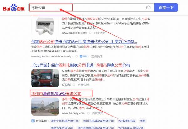 涿州市海*機械設備有限公司網站優化排名效果展示