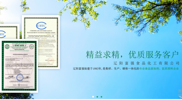 遼陽富強秉承“產品質量第一、信譽第一、服務第一”的宗旨。為了保證產品質量,遼陽富強具有實驗室、菌檢室及開發部,嚴格按照《美國藥典》(USP)、《英國藥典》(BP)、《美國食品化工典》(FCC)版的標準進行生產與檢驗。遼陽富強的產品全部遠銷歐美、東南亞等國家和地區。高質量的產品,周到的服務得到了國內外客戶的認可和好評,獲得了他們的信賴,建立了長期合作的業務關系。因此,遼陽富強竭誠歡迎國內外客戶前來洽談業務,進行合作,共同發展。