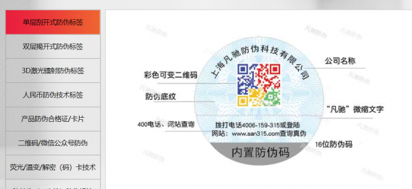 上海凡馳防偽科技有限公司總部位于中國上海,是國內針對一物一碼研究與應用的軟件技術型企業,也是目前國內少數擁有自主技術開發能力及云計算數據平臺的技術型服務企業。多年來,凡馳防偽科技始終堅持以專業的態度與領先的科學技術,為企業提供包括產品防偽、質量追溯、物流防竄貨、會員積分管理等在內的全方位防偽整合解決方案。凡馳防偽主營產品有:防偽標簽(二維碼防偽標簽、微信防偽標簽、易碎防偽標簽、VOID防揭材料防偽標簽、雙層揭開式防偽標簽、激光防偽標簽、人民幣防偽技術標簽等)、防偽卡片證書(防偽合格證、防偽門票、防偽代金券及可加防偽技術的其他證書類產品等)、信息化系統(防偽系統、物流防竄貨系統、防偽追溯系統、會員積分系統、二維碼紅包系統 )及其他防偽產品專業化定制。