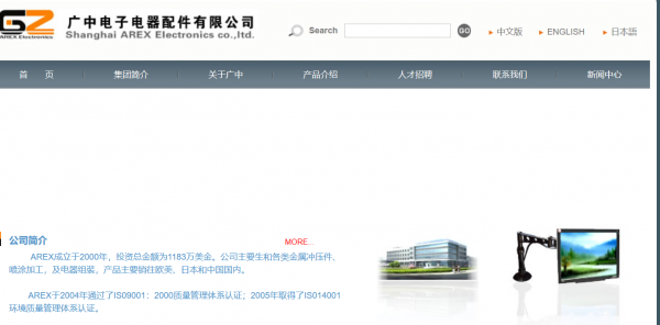 AREX成立于2000年,投資總金額為1183萬美金。位于上海市嘉定區(qū)馬陸鎮(zhèn)豐茂路889號 ,目前擁有兩萬五千平方米的廠房,以及潔凈室和高精度高噸位之機器,2008年營業(yè)額為4.1億。在全球性的經(jīng)濟危機中,廣中電子盡力改善員工福利,加大研發(fā)力度,拓展新業(yè)務,僥幸仍能保持業(yè)績,并為政府貢獻較高的稅收。公司主要生 產(chǎn)各類金屬沖壓件、噴涂加工,及電器組裝,產(chǎn)品主要銷往歐美、日本和中國國內(nèi) ,2007年起增加節(jié)能減排之LED光源的研發(fā)與制AREX于2000質(zhì)量管理體系認證;2005年取得了IS014001環(huán)境質(zhì)量管理體系認證。