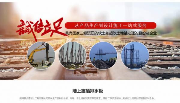 建湖縣全*巖土工程有限公司是從生產塑料排水板、陸域、水上插板到真空預壓施工,具有 二級資質的軟土和超軟土地基處理的股份制企業。成立于一九八九年,現有廠房近萬平米,各種施工設備3200臺套,其中塑料排水板打樁設備100多臺套,真空預壓設備3000余臺套,水上插板施工船、錨艇、拖輪等配套設施。擁有經驗豐富高素質的專業精英,有職稱的工程技術、經濟、會計師等龐大專業技術人員。具有多種軟土和超軟土地基處理的施工經驗和成熟的真空預壓軟基處理技術,承擔各類公路、鐵路、機場、港口、碼頭、圍堰、圍海吹填造陸等軟地基處理工程,采用真空預壓法在吹填土和深層淤泥土層進行地基處理展現突出優勢,特別是在圍海工程水上打設料排水板成就了核心技術力量,創建了多項優良工程。是國內最早規模最大 從生產土工材料、施工機械到打設塑料排水板、真空預壓施工一條龍服務的公司,歷年被評為省重合同守信用企業,省金融AAA級企業。