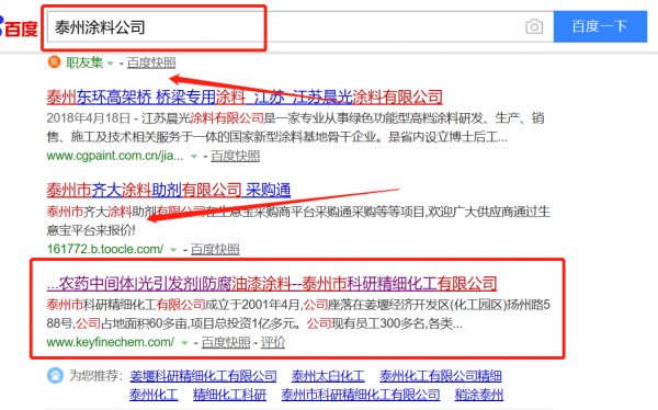 我們公司與泰州市科研精細化工有限公司合作中,對這個公司所經營的涂料這個行業(yè)提供了SEO推廣,與該公司的合作,更多的客戶讓我們公司為其提供SEO推廣,通過每一次合作,我們公司不斷完善自己,同時希望合作伙伴在經營的路上越來越好。
