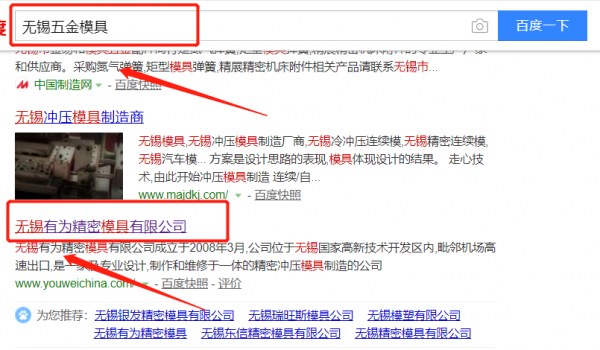 無(wú)錫有為精密模具有限公司用我司企業(yè)五金模具的網(wǎng)站優(yōu)化產(chǎn)品,其SEO關(guān)鍵詞有五金模具。一對(duì)一定制服務(wù),產(chǎn)品經(jīng)理在線支持,無(wú)憂售后,適用于各個(gè)企業(yè),提供一站式網(wǎng)絡(luò)營(yíng)銷服務(wù)。百度搜索引擎優(yōu)化,提升品牌關(guān)鍵詞的正面內(nèi)容信息展現(xiàn),體現(xiàn)良好的口碑宣傳。無(wú)錫有為精密模具有限公司成立于2008年,是經(jīng)無(wú)錫市市場(chǎng)監(jiān)督管理局審核的有資質(zhì)的公司,其統(tǒng)一社會(huì)信用代碼:91320214567833281C。公司地址:江蘇省無(wú)錫市新吳區(qū)梅村新風(fēng)路60號(hào)。