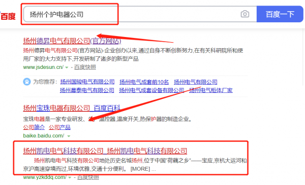 揚州*電電氣科技有限公司百度關鍵詞排名保證在首頁效果