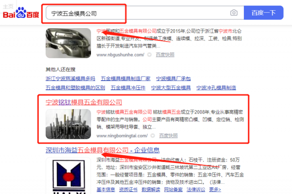 寧波*鈦模具五金有限公司選用我司企業五金模具的網站優化產品,其SEO關鍵詞有五金模具。3-15天快速提升網站前五頁關鍵詞排名上百度首頁,幫助客戶增加流量,提高成交量,為您帶來更多潛在客戶,打造客戶品牌影響力。寧波*鈦模具五金有限公司成立于2008年,是經寧波市市場監督管理局審核的有資質的公司,其統一社會信用代碼:91330211M**CJD3F2T。公司地址:浙江省寧波市鎮海區駱駝街道汶駱路288號2-525室。