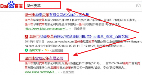 溫州市雪地皮革有限公司選用我司企業皮革的網站優化產品,其SEO關鍵詞有皮革制品加工、制造。主要針對百度、搜狗、360等搜索引擎進行快速排名優化服務,關鍵詞排名必要條件是在搜索結果前3頁,周期15天內可優化到搜索引擎首頁。溫州市雪地皮革有限公司成立于2003年,是經溫州市市場監督管理局審核的有資質的公司,其統一社會信用代碼:91330300754911193L。公司地址:浙江省溫州浙南鞋料市場B區521號。