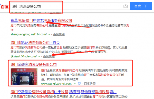 廈門金毅家清洗設備有限公司選用我司企業洗滌設備的網站優化產品,其SEO關鍵詞有洗滌設備。通過百度SEO優化排名技術幫助企業網站挖掘客戶潛在需求,提升關鍵詞排名和客戶咨詢量。通過搜索引擎優化為企業帶來持續、低成本的自然流量,提升企業銷售額,使企業由被動營銷網絡推廣變為主動營銷網絡推廣。廈門金毅家清洗設備有限公司成立于2014年,是經廈門市市場監督管理局審核的有資質的公司,其統一社會信用代碼:91350211302807635Y。公司地址:福建省廈門市集美區灌口鎮李林村溪南社225號一層。