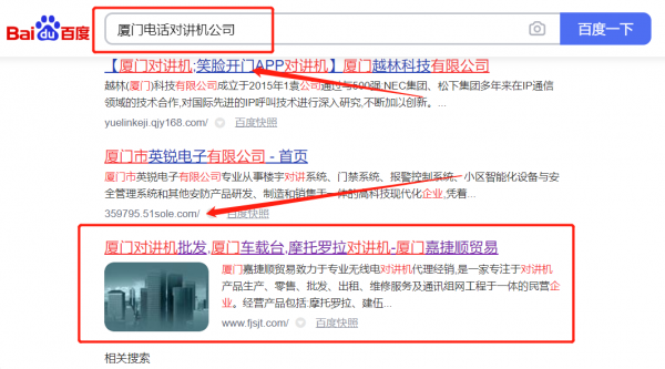 我們公司與廈門嘉*順貿易有限公司合作中,對這個公司所經營的電話對講機這個行業提供了快速排名,與該公司的合作,更多的客戶讓我們公司為其提供SEO優化,通過每一次合作,我們公司不斷完善自己,同時希望合作伙伴在經營的路上越來越好。