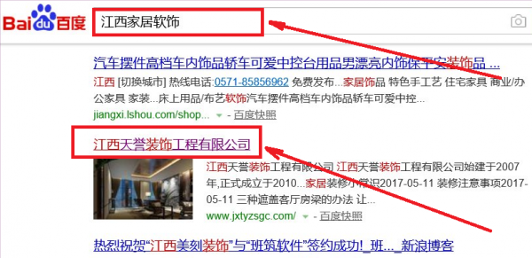 我們公司與江西天譽(yù)裝飾工程有限公司合作中,對這個公司所經(jīng)營的家居軟飾這個行業(yè)提供了百度快照排名,與該公司的合作,更多的客戶讓我們公司為其提供百度快照排名,通過每一次合作,我們公司不斷完善自己,同時希望合作伙伴在經(jīng)營的路上越來越好。