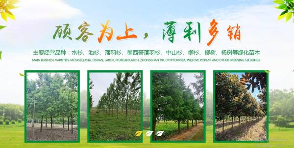 主要經(jīng)營品種:水杉、池衫、落羽杉、墨西哥落羽杉、中山杉、柳杉、柳樹、楊樹等綠化苗木,產(chǎn)業(yè)銷售到了湖北、四川、重慶、廣東、江蘇、上海、浙江、福建、河南、安徽、貴州等地,不同規(guī)格,應有盡有。